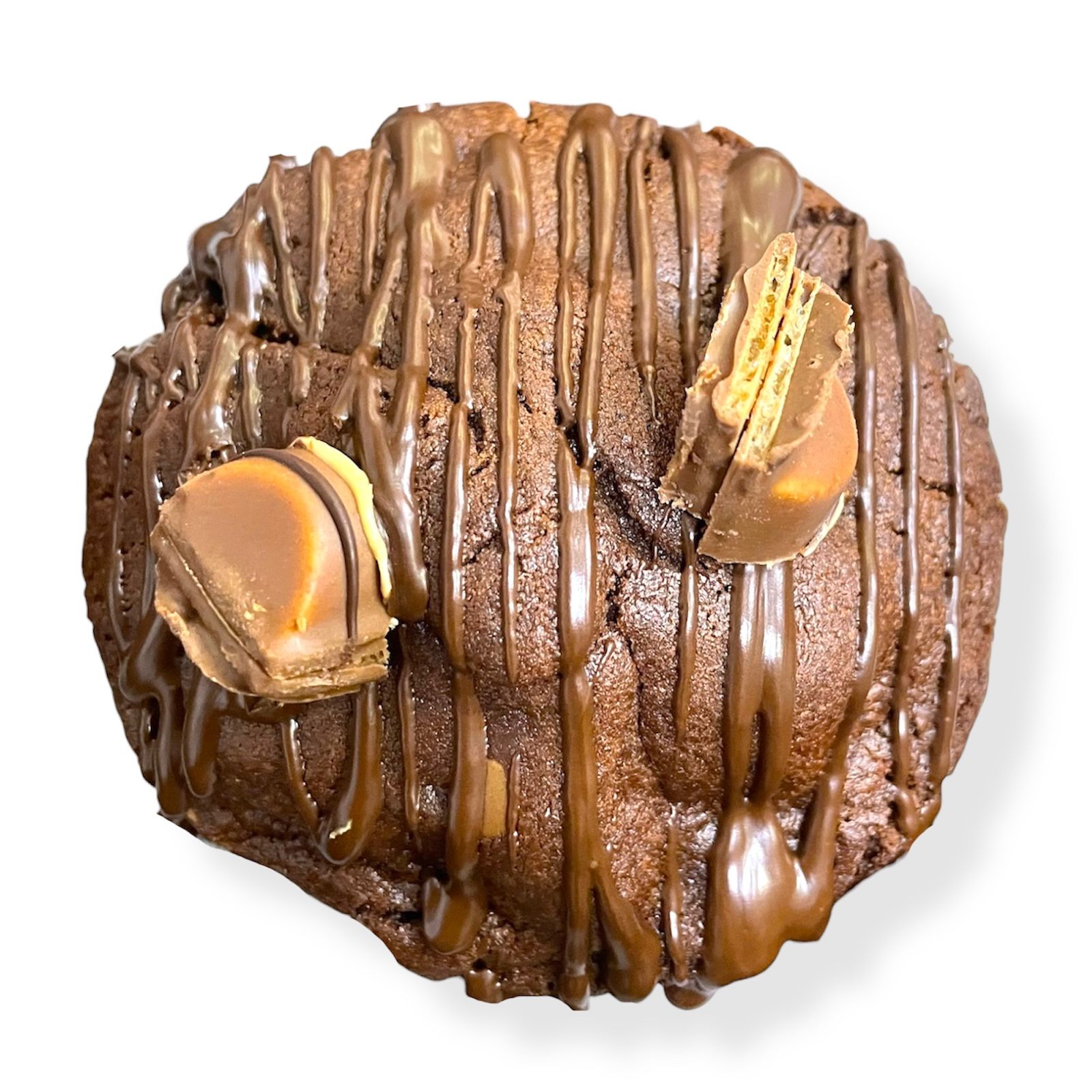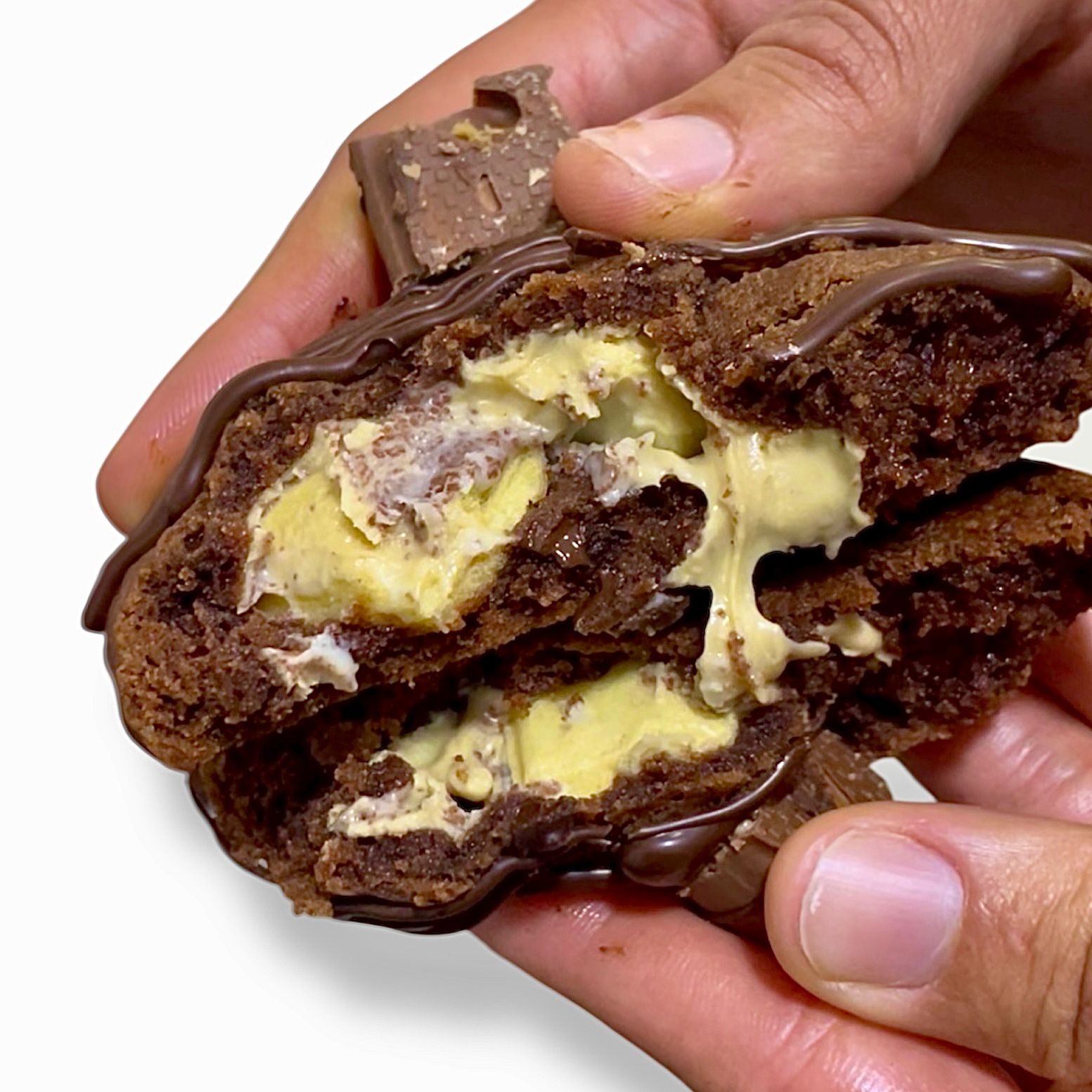Galleta de masa de chocolate rellena de crema kinder y chocolate Kinder Bueno.